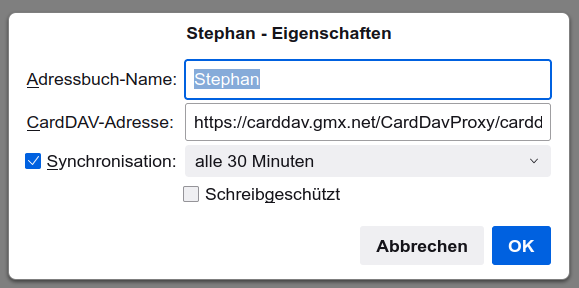Da kannst Du wenn Du willst dem Adressbuch (wie ich es gemacht habe) einen eigenen Namen geben. Und einstellen in welchen Zeitschritten das Adressbuch Synchronisiert werden soll.