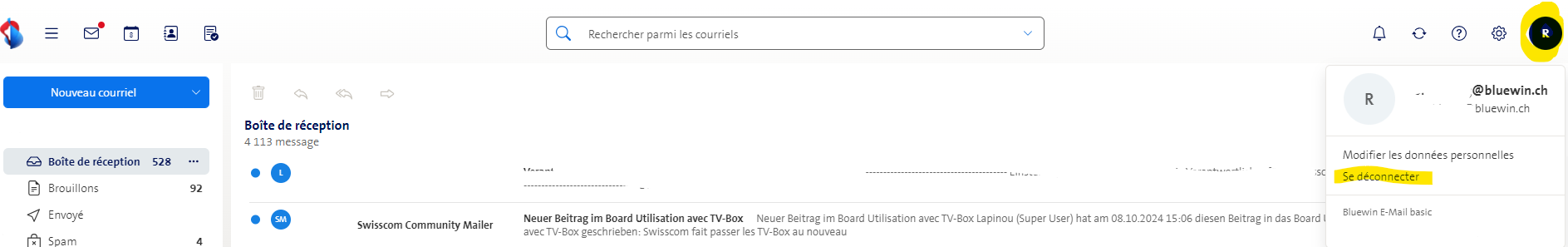 Pierrot7007 Il n'était pas nécessaire de se déconnecter explicitement, on pouvait aussi simplement fermer la fenêtre, mais ce n'était pas recommandé. C'est toujours le cas, on peut se déconnecter explicitement dans la nouvelle version en cliquant sur la photo de profil en haut à droite (chez moi le R, voir image ci-dessous) et ensuite sur " se déconnecter ".