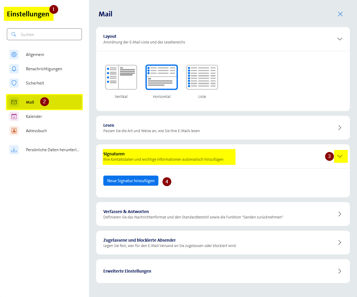 Weitere Einstellungen: Hilfeartikel Einstellmöglichkeiten neues Webmail (PC)