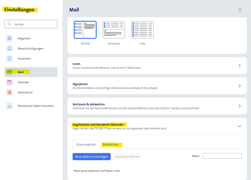 Wo kann ich bei Swisscom eine Blacklist für unerwünschte Email-Absender erstellen?