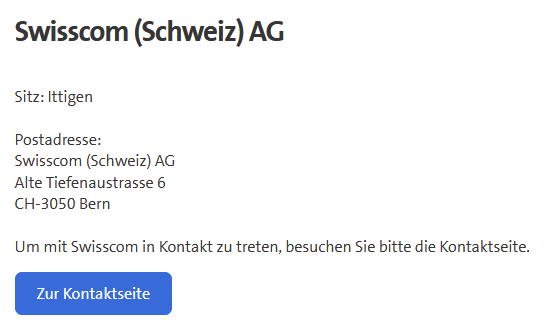 Samsi @Heuppeupri78 Gebe ich "Adresse Swisscom" bei Google ein, habe ich in weniger als 1 Sekunde ein Resultat. Swisscom AG Alte Tiefenaustrasse 6 CH-3050 Bern Grundsätzlich ist es aber besser auf andere Weise mit Swisscom in Kontakt zu treten. Dafür gibt es die offiziellen Kanäle. Siehe hier: https://www.swisscom.ch/de/privatkunden/hilfe/kontakt.html