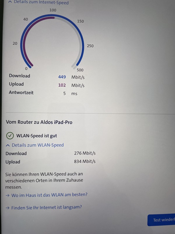 Auf kurze Distanz sollte da auf dem Handy auch Deine max. Internetgeschwindigkeit von ca. 500/100 Down/Up durchgereicht werden können.