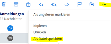 Eine oder mehrere E-Mails markieren -> 3-Punkte-Menu oben in der Mitte der E-Mail-Liste (siehe Bild unten) -> Als Datei speichern