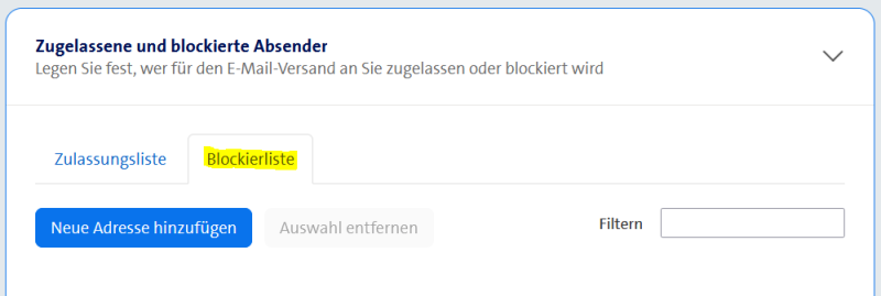 Zahnrad-Menü -> Alle Einstellungen -> Mail -> Zugelassene und blockierte Absender -> Blockierliste