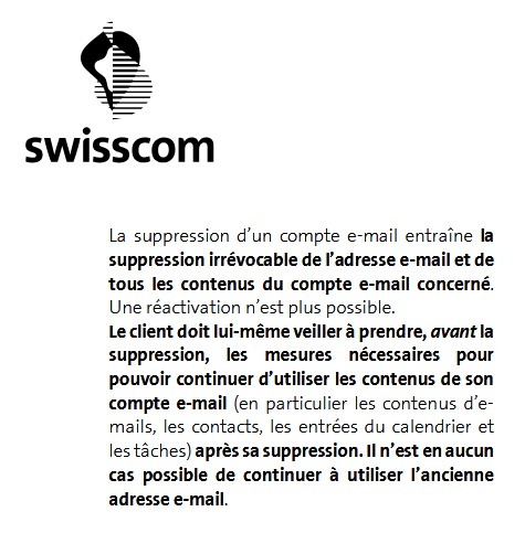 J’ai un problème avec une ancienne adresse e-mail Bluewin/Swisscom. Cette adresse a été suspendue il y a plus de 180 jours, et selon les informations officielles elle devrait être définitivement supprimée passé ce délai.