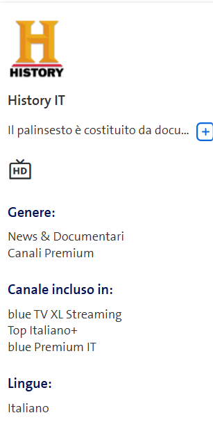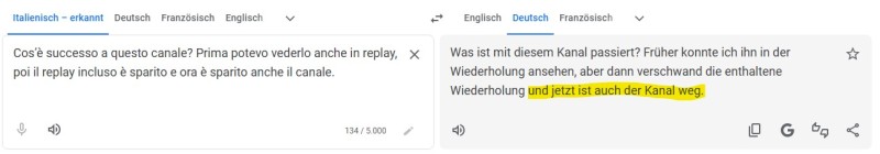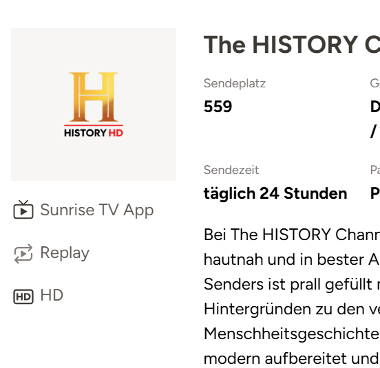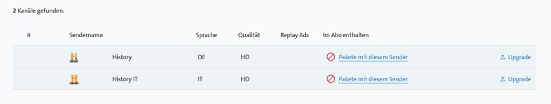 WalterB 😀 Tatsächlich ist meiner Erfahrung der Google beim Italienisch (vor D nach ITA) besser, war so auf das Replay fixiert, dass ich den Satz nicht mehr gelesen habe, zumal ich vorher schon gesehen, dass die beiden History Sender ohne Probleme bei mir laufen, auf allen melden. @Rreimpeimpeil15 haben Sie mal Ihre Senderlistw überprüft, dann die Swisscom Liste benutzt, dann auf verschiedenen Medien geprüft (App, Box, TV am Computer, etc.)? Haben Sie vielleicht, das Premium IT gekündigt? Wie gesagt, der Sender ist da und funktioniert, Replay nicht.