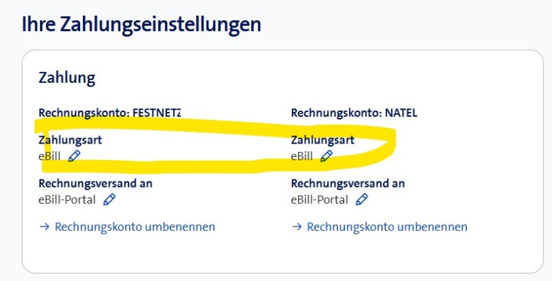 GuidoL Fioprompab89 eBill must du in deinem eBanking beantragen. Alle Infos dazu findest du hier: eBill – so einfach ist Bezahlen Im https://www.swisscom.ch/myswisscom kannst du unter Rechnungen -> Einstellungen -> Zahlart die Zahlart auf eBill umstellen.