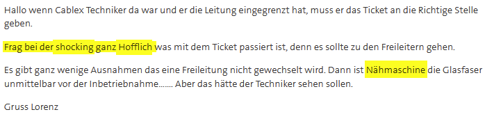 Bilan de la visite qui a eu lieu début mars : selon le technicien Cablex la ligne est bel et bien défectueuse et doit être changée. Depuis lors, aucune nouvelle de Swisscom, et quand j'appelle le service client, on me dit qu'il n'y a plus de trace de la visite de Cablex dans les systèmes (malgré avoir fourni le rapport de service), et on m'annonce que l'on va me rappeler à ce propos….ce qui bien entendu n'arrive jamais.