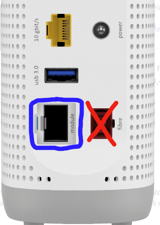 Ah ah, je me demande si tu as bien tout fait correctement lors de ta commande. À première vue, si je comprends bien, tu es encore en connexion cuivre (VDSL/gfast), avec un raccordement à la prise murale de couleur violette. À mon avis, tu ne disposes donc pas encore de la fibre optique à ton domicile, et aucune prise fibre n’est installée chez toi.