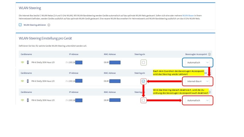 Wenn ich im Internetbox GUI unter WLAN --> WLAN-Steering die Zuordnung des Accesspoints einrichte, wird das WLAN-Steering aktiviert. Will ich das Steering wieder deaktiviert, spring die Zuordnung des Accesspoints zurück auf automatisch. Das WLAN-Steering führt dazu, dass IOT Devices die ein schwaches Signal haben abgehängt werden. Einerseits dadurch, der der Accesspoint automatisch ist, das Device auf einen anderen Accesspoint geroutet werden und anderseits, wenn das Steering aktiv ist, auf ein anderes Band geschaltet wird. Meine Shellys können aber nur 2.4 GHZ