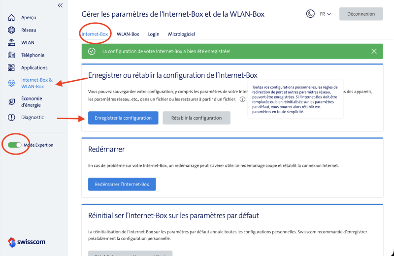 Pour sauvegarder ta box Internet 5, tu dois te rendre depuis ton PC sur la page web de l’interface du routeur à l’adresse 192.168.1.1, puis suivre ma capture d’écran. Ensuite, en cliquant sur l’icône Sauvegarder, un fichier sera transféré sur ton PC.