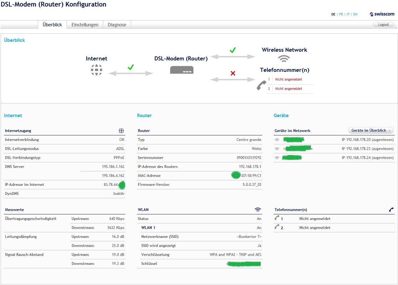MesswerteÜbertragungsgeschwindigkeitUpstream:11016 KbpsDownstream:27527 KbpsLeitungsdämpfungUpstream:18.7 dBDownstream:18.3 dBSignal-Rausch-AbstandUpstream:15.6 dBDownstream:19.2 dB