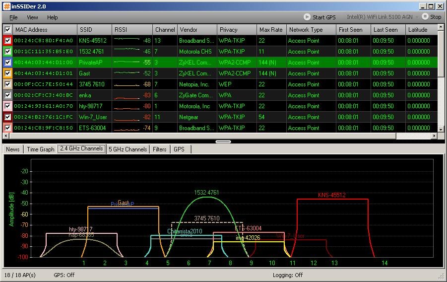 schalte mal im inSSIDer im unteren Bereich auf das Register “2.4GHz Channels”, dort sieht man am besten die Kanalbelegung und deren Stärke.